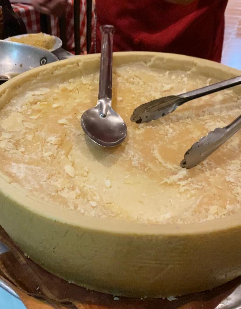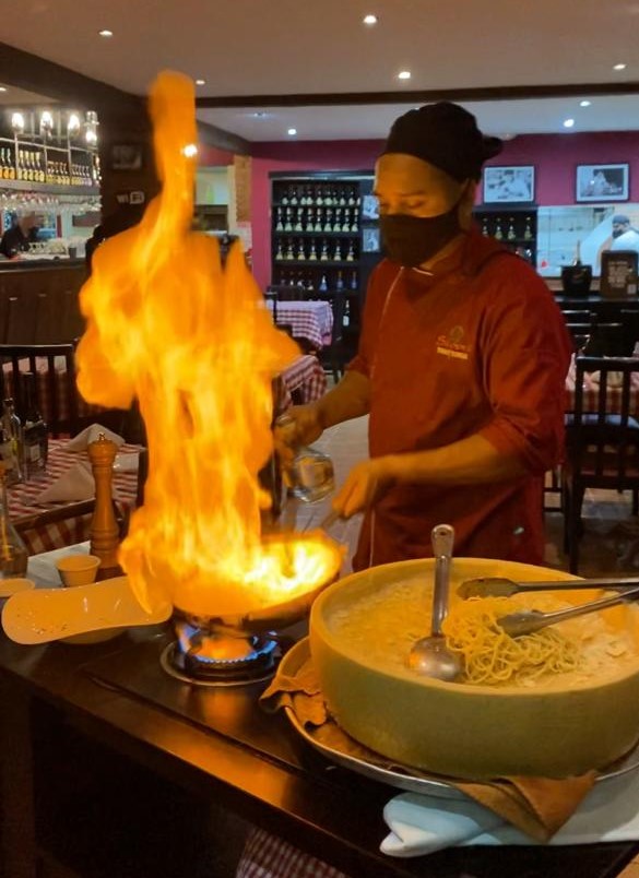 ¡El platillo es toda una experiencia gastronómica! Su preparación es un espectáculo: comienzan por el raspado del queso parmesano, que es una rueda gigante, sigue con aromático licor de uva italiano: el famoso grappa y sobre la rueda de queso se vierte la pasta cocinada al dente. ¡No les puedo explicar el olor!