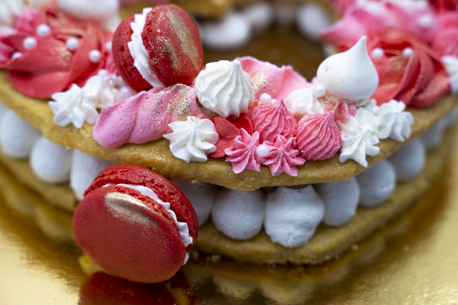 Su sabor sinigual se complementa con su presentación, ya que está decorado con flores y macarons, esta delicia francesa en colores rosas y rojos de diferentes tonalidades, como sinónimo de amor.